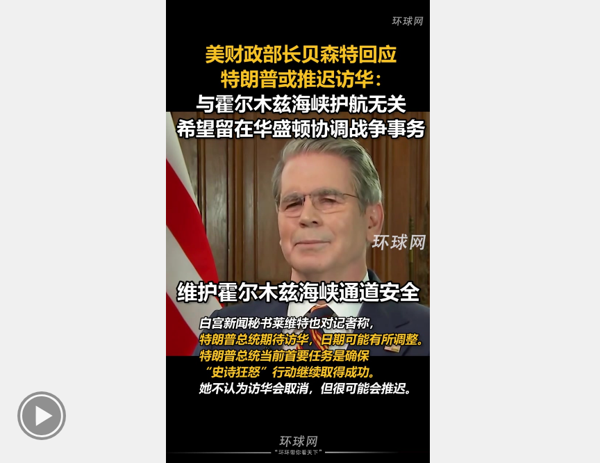 美財政部長貝森特回應特朗普或推遲訪華:與霍爾木茲海峽護航無關,希望留在華盛頓協調戰爭事務