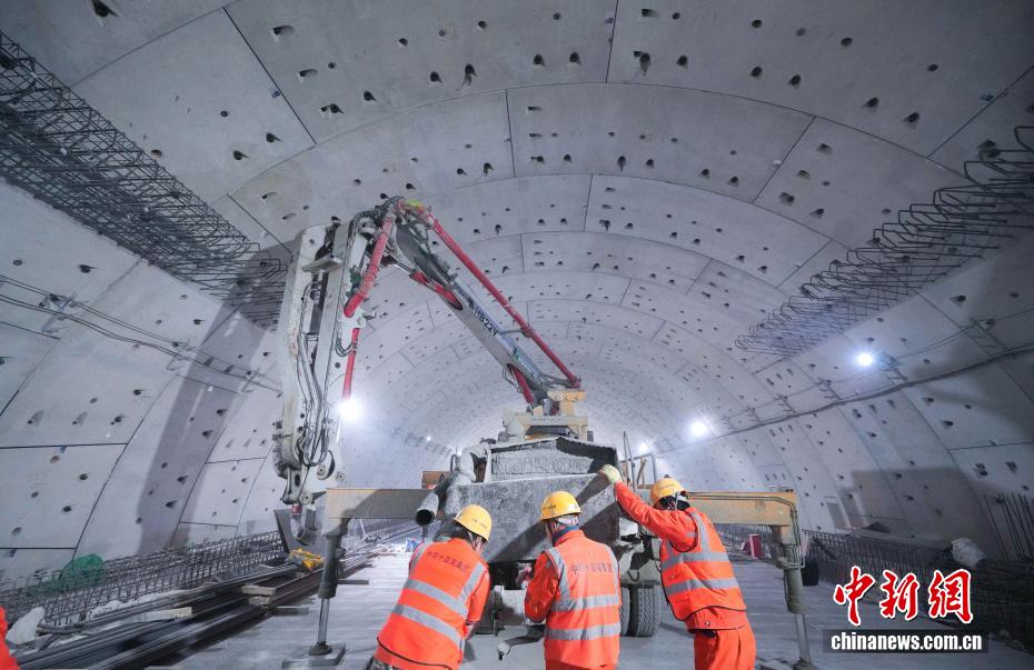 3月17日,山東濟南,世界最大水下盾構隧道——濟南黃崗路黃河隧道順利實現雙層貫通。圖為3月16日晚,施工人員正在澆築現澆車道板。據了解,隧道全長約5.75公里,其中盾構段長約3.3公里,採用開挖直徑17.5米的“山河號”盾構機施工。