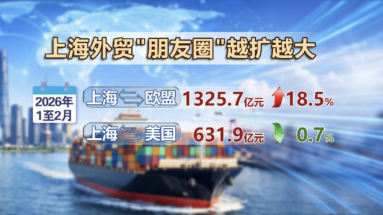 這背後離不開上海外貿市場的多元布局。貿易"朋友圈"的老朋友關係深化。前2個月,上海市對第一大貿易夥伴歐盟進出口1325.7億元,增長18.5%。對美國進出口631.9億元,出口降幅顯著收窄至0.7%。