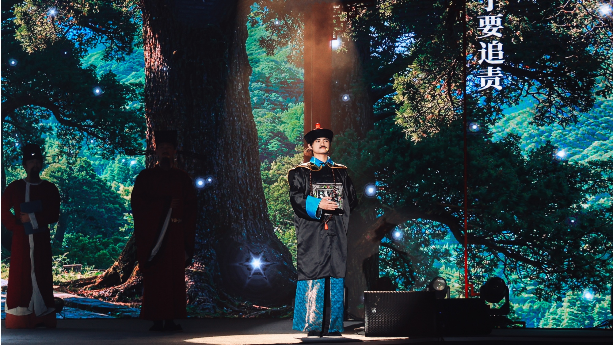 “三百年護柏成廊,非一日之功,乃官民共守律例之果。”舞臺上,張鵬翮屏幕里的翠雲廊背景說道,臺下觀眾無不動容。