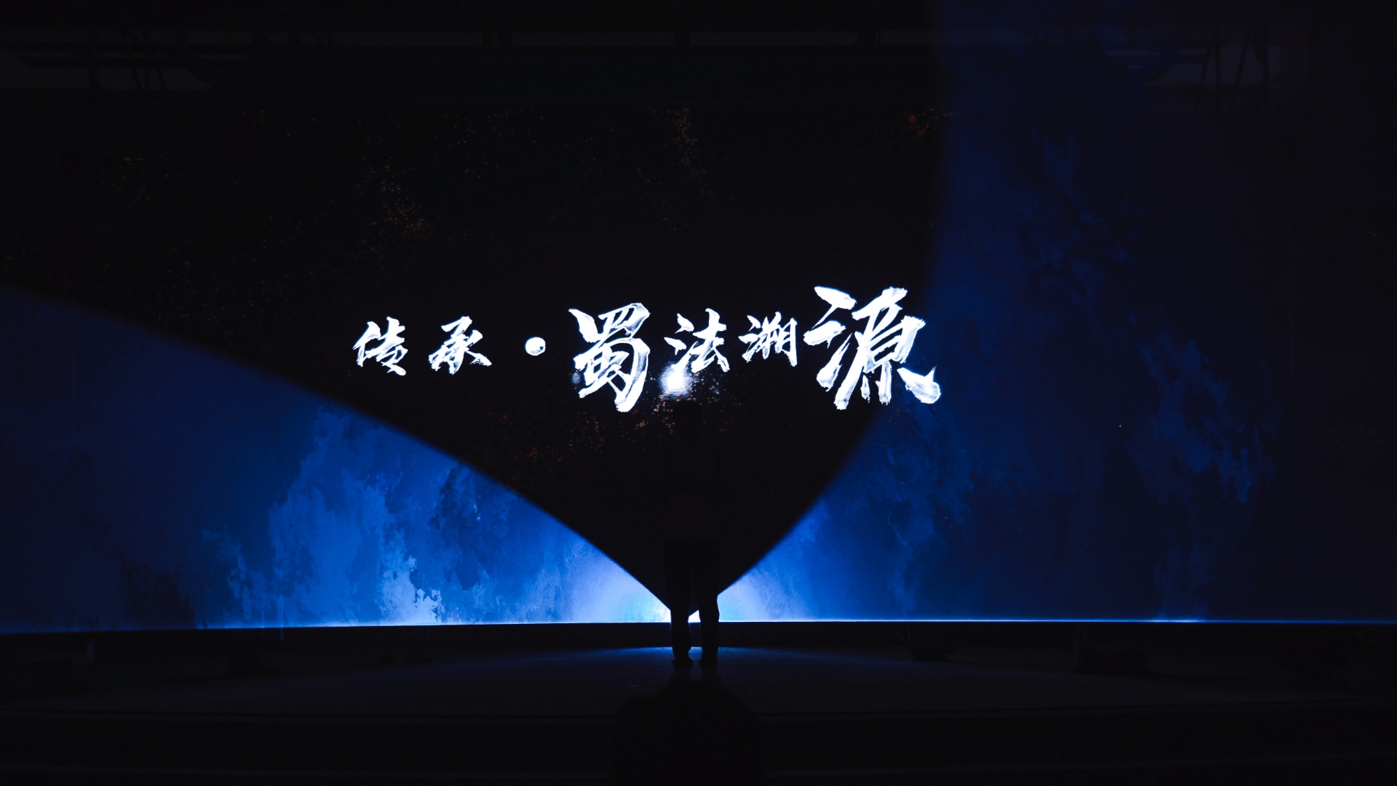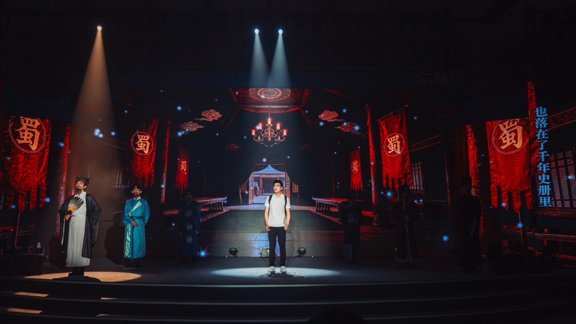 舞臺劇尾聲,六位先賢並肩而立,汪國偉舉起手中的《名錄》,面向觀眾,高喊:“蜀法之光,川流不息。”