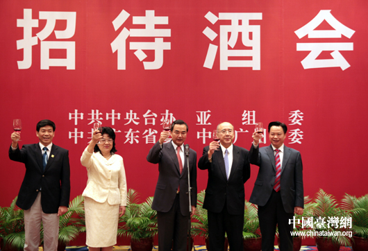 中共中央臺辦主任王毅在酒會致辭中表示,廣州亞運會是亞洲的盛會,也是一次兩岸的盛會。在兩岸關係取得重大積極進展這一新的歷史背景下,廣州亞運會將成為繼北京奧運會、上海世博會之後兩岸同胞加強聯係、增進了解、融洽感情的又一重要平臺,相信每一位臺灣同胞在這里都可以感受到友善與熱情,每一位臺灣體育健兒在這里都能夠展示出自己的風採。中共中央臺辦將繼續與廣州亞組委及其它有關方面保持密切溝通與配合,切實做好各項接待和服務工作,為中華臺北體育代表團提供一個公平的競賽環境,為臺灣各界同胞營造一個溫馨的觀賽氛圍。同時,我相信大陸同胞特別是廣州民眾也一定會伸出雙手,為臺灣的體育健兒鼓勁和加油。