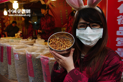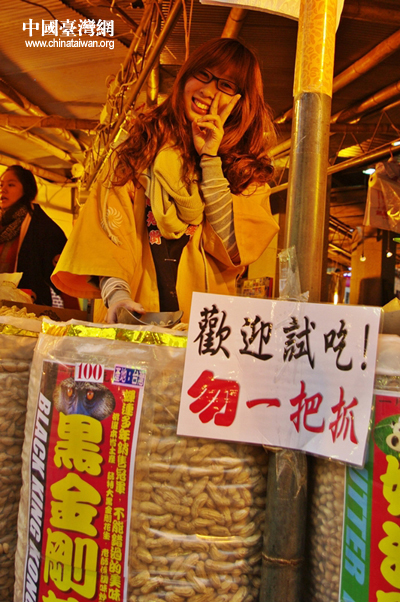 魷魚絲以各種口味及色彩,向往來的的遊客盡情招手。 也有攤商銷售福袋,現買現兌獎,逛街也可賭賭運氣。 口罩美女,向筆者推銷個頭很小的蠶豆酥。 黑金剛是花生的品種,透過正妹展顏一笑,過客通通變成了買家。