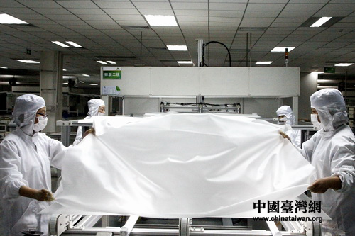 10月26日,感知甘肅全國網絡媒體記者團走進太陽能光伏發電設備生產基地。圖為工人正在為太陽能電池板鋪設微晶薄膜。 (中國臺灣網記 董憲超 攝)