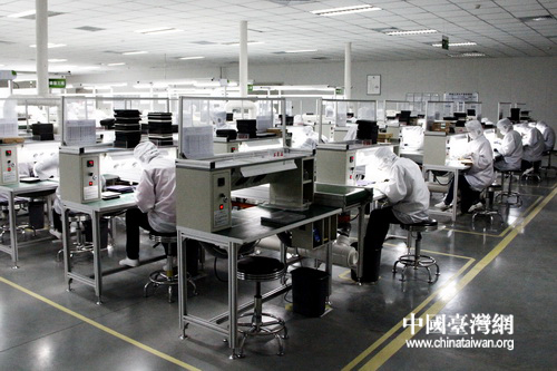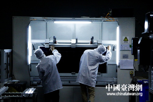 10月26日,感知甘肅全國網絡媒體記者團走進太陽能光伏發電設備生產基地。圖為工人們正在加工生產微晶薄膜太陽能電池。 (中國臺灣網記者 董憲超 攝)