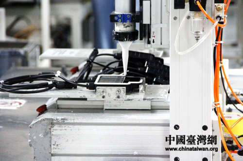 10月26日,感知甘肅全國網絡媒體記者團走進太陽能光伏發電設備生產基地。圖為自動化機械臂正在為太陽能電池板上膠。 (中國臺灣網記者 董憲超 攝)