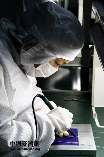 10月26日,感知甘肅全國網絡媒體記者團走進太陽能光伏發電設備生產基地。圖為工人正在焊接太陽能電池面板。 (中國臺灣網記者 董憲超 攝)