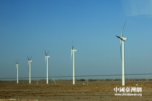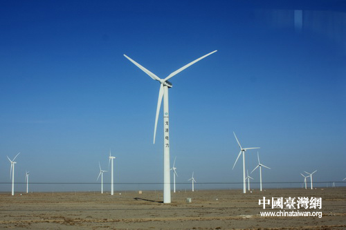 10月26日,感知甘肅全國網絡媒體記者團參觀全國首個千萬千瓦級風電基地。圖為西北戈壁灘上獨有的風力發電機組風貌。 (中國臺灣網 董憲超 攝)