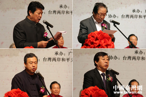 中國文聯副主席、黨組副書記覃志剛,中國美術家協會主席劉大為,中國畫學會秘書長孫克,臺灣兩岸和平文化藝術聯盟總會秘書長李沃源在開幕式上致辭。(中國臺灣網 李傑 攝)