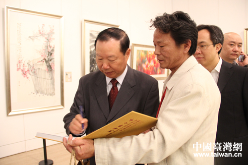 海峽兩岸關係協會前會長陳雲林在參觀展覽時與嘉賓及畫家合影。(中國臺灣網 李傑 攝)