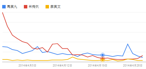 中國臺灣網4月30日消息 從反服貿學運到反核四運動,身為臺灣地區最高權力者,關于馬英九的網絡信息也越來越多。對此,有臺灣媒體對比了馬英九、林飛帆、蔡英文與蘇貞昌四人近30日的Google搜尋趨勢,以尋找端倪。