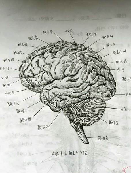 “第一幅畫的是腦幹,第二幅畫的是大腦,第三幅是手神經。”趙琳琳向記者分別介紹了她作業本上面的三幅解剖圖。她告訴記者,她曾經學過半年的繪畫,有一定的繪畫基礎,所以畫這些解剖圖時感覺並不是很難,但是畫一張這樣解剖圖大概需要三十分鐘的時間。