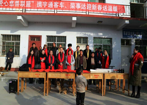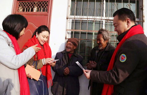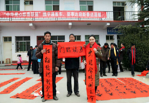2016年1月9日,新春佳節即將到來之際,在豫西伏牛山區國家級貧困攻堅縣洛陽嵩縣車村鎮黃柏村的村委會大院里,歌聲悠揚,人頭攢動。今天,這里從省會鄭州趕來了一支《中原愛心慈善聯盟》慰問團,此次暖冬行動由“中原愛心慈善聯盟”主席、河南省扶貧先進人物李豐源,副主席、河南衛視文藝部梅曉冬主任,國家一級播音員、中國致公黨員、中原愛心慈善聯盟秘書長田曉燕倡議發起,“榮事達”河南總代理劉美英女士提供愛心物資。宇通客車全程免費提供車輛,著名書法家王隨寧、王鐵中、李方勇、紀志華、馬遷、劉雨、蘇盼七人他們不計得失、無私奉獻,揮毫潑墨為家家戶戶老百姓書寫春聯,愛心扶貧團隊不辭勞苦帶著慰問品深入山區,他們放棄了假日休息時間到貧困山區,用實際行動為26戶貧困家庭送去春節的慰問金及生活用品。為十個貧困孩子送上慰問金共5000元。此次活動得到了河南省扶貧辦、河南省旅遊局、人民日報河南新聞中心、河南衛視、河南電視臺新農村頻道《夢想啟航》欄目、鄭州電視臺、鄭州日報的大力支持。