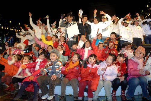 1月1日淩晨,北京奧運會志願者“微笑圈”國際版發布儀式暨志願者迎接2008慶典活動在北京鐘鼓樓舉行,來自社會各界的近千人參加了活動,出席儀式的領導共同發布了奧運志願“微笑圈”國際版。1日零時,鐘樓上被譽為“古鐘之最”、重達63噸的報時銅鐘被敲響,宣告新的一年到來,同時把志願者的微笑和祝福傳向四方。 新華社記者羅曉光攝