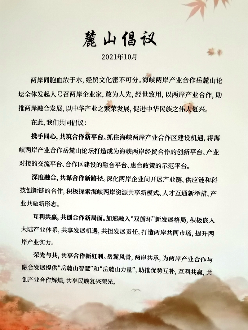 助推兩岸融合發展 《海峽兩岸產業合作岳麓山論壇倡議書》發布