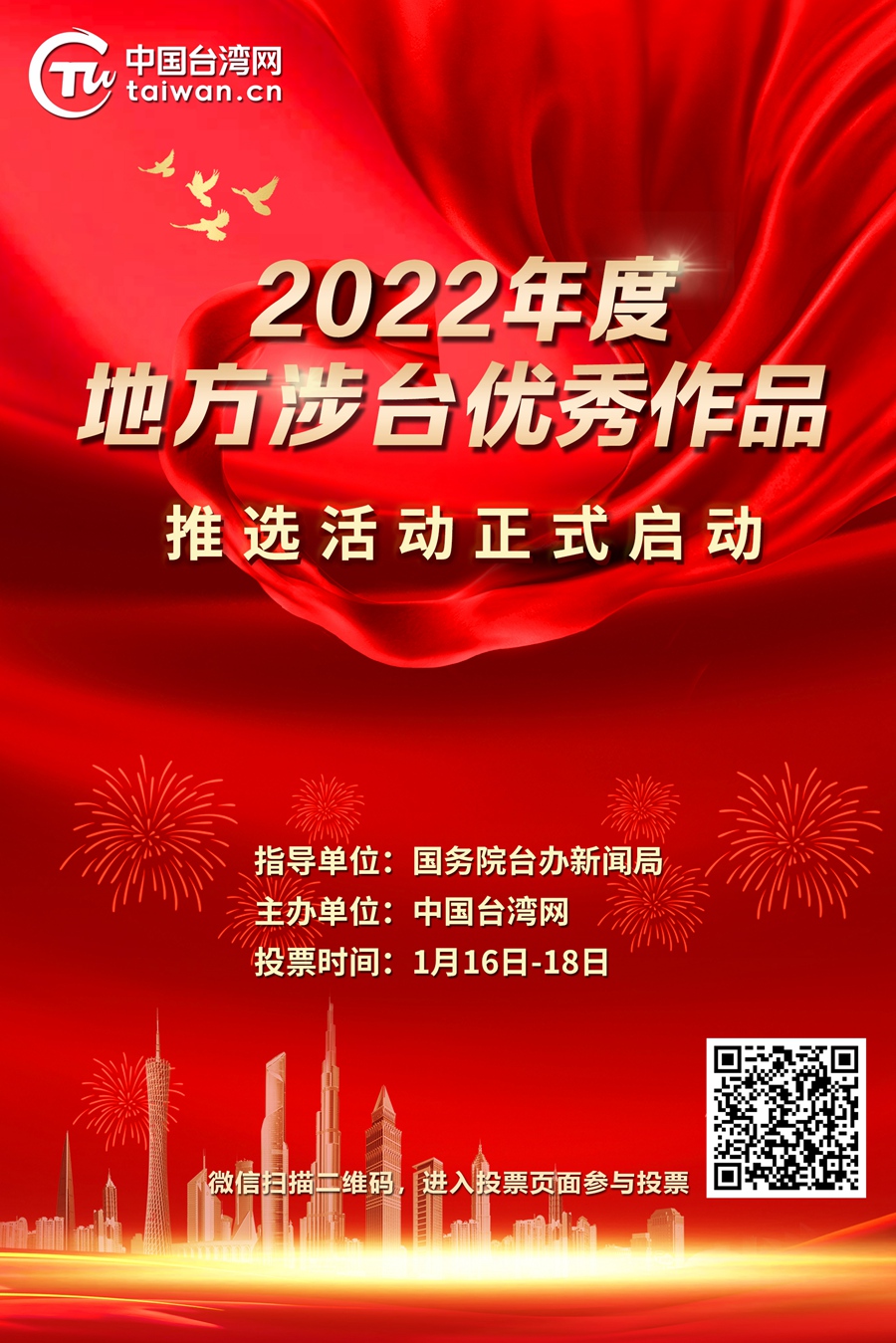 為盤點、梳理過去一年來地方涉臺活動精彩亮點,展示各地涉臺宣傳報道成效。經國臺辦批準,中國臺灣網“2022年度地方涉臺優秀作品”推選活動于1月16日正式上線啟動。本次推選活動共設置優秀稿件、優秀視頻、優秀新聞圖片三個獎項。兩岸網友可通過新浪微博、今日頭條、微信公眾號、Facebook等新媒體平臺進行投票。