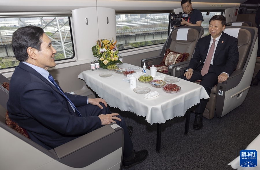 3月31日下午,中共中央臺辦、國務院臺辦主任宋濤(右)與馬英九先生(左)同乘高鐵從武漢赴長沙。新華社記者 才揚 攝