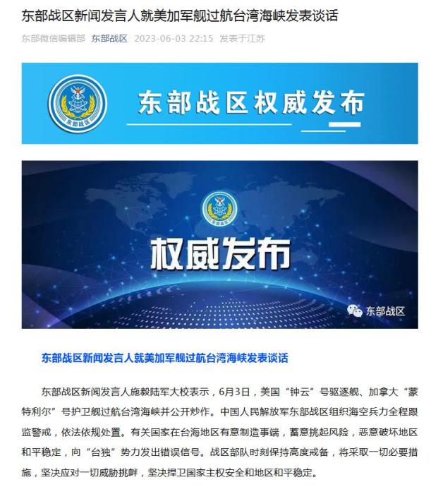 中新網6月3日電 據東部戰區微信公眾號消息,東部戰區新聞發言人施毅陸軍大校表示,6月3日,美國“鐘雲”號驅逐艦、加拿大“蒙特利爾”號護衛艦過航臺灣海峽並公開炒作。中國人民解放軍東部戰區組織海空兵力全程跟監警戒,依法依規處置。有關國家在臺海地區有意制造事端,蓄意挑起風險,惡意破壞地區和平穩定,向“臺獨”勢力發出錯誤信號。戰區部隊時刻保持高度戒備,將採取一切必要措施,堅決應對一切威脅挑釁,堅決捍衛國家主權安全和地區和平穩定。