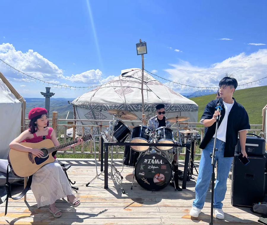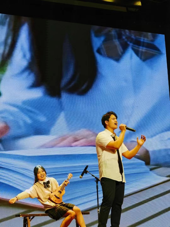 林桐宇參加清華大學法學院學生節,演唱《七里香》,右一為林桐宇。 (林桐宇供圖,中國臺灣網 發)