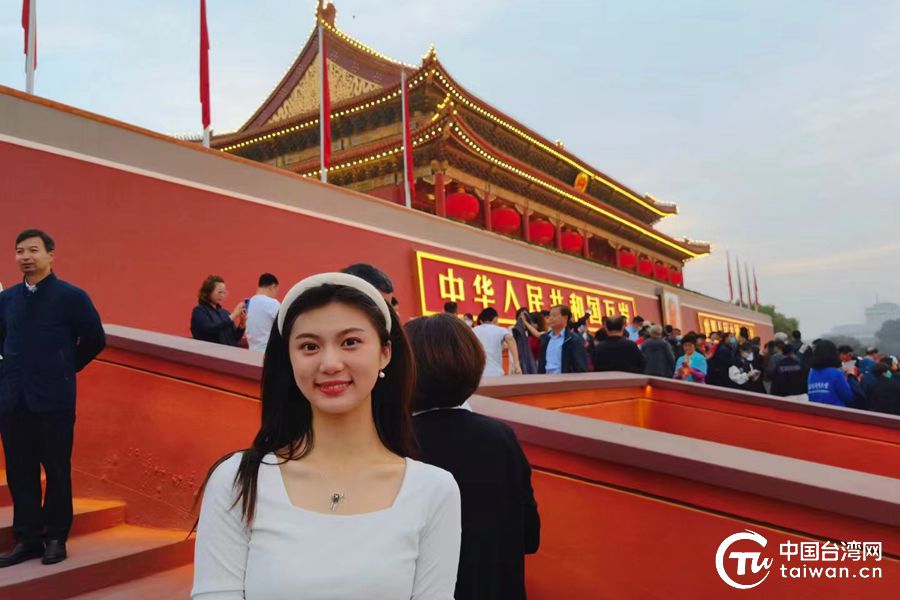 王陳怡嫻在天安門觀禮升國旗。(王陳怡嫻供圖,中國臺灣網 發)