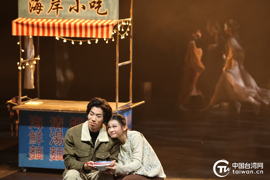 表演中,兩位舞者推著“兩岸小吃”車,時而踏樂而舞,面對“風浪”時,又依偎在一起,攜手而行,畫面溫馨動人。
