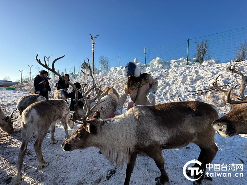臺灣同學與馴鹿親密接觸。(中國臺灣網 李柏濤 攝)