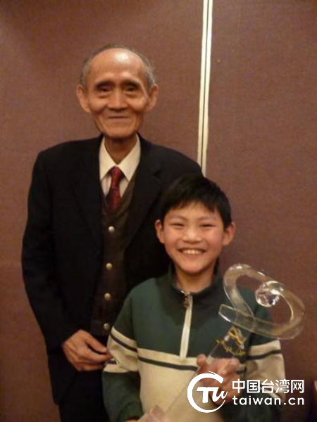 2012感動中國年度人物評選揭曉,菏澤旅臺同鄉會會長高秉涵成功入選。左一為高秉涵先生,左二為9歲的劉承志。(中國臺灣網 發)
