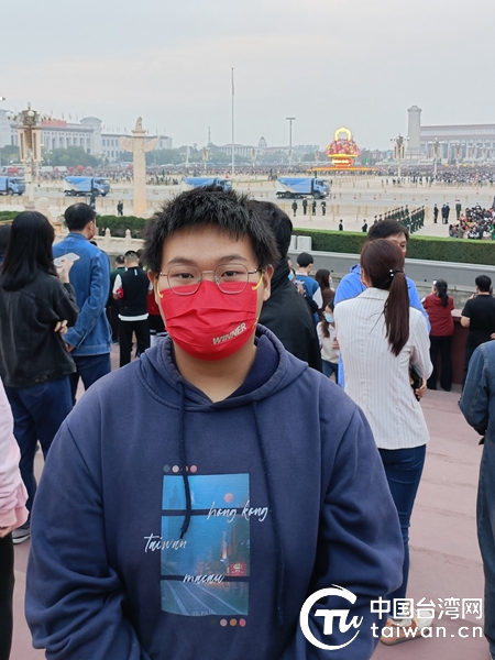 2022年10月1日,北京大學臺生劉昱甫參加全國臺聯組織在京臺生觀禮天安門升旗儀式留念。(中國臺灣網 發)