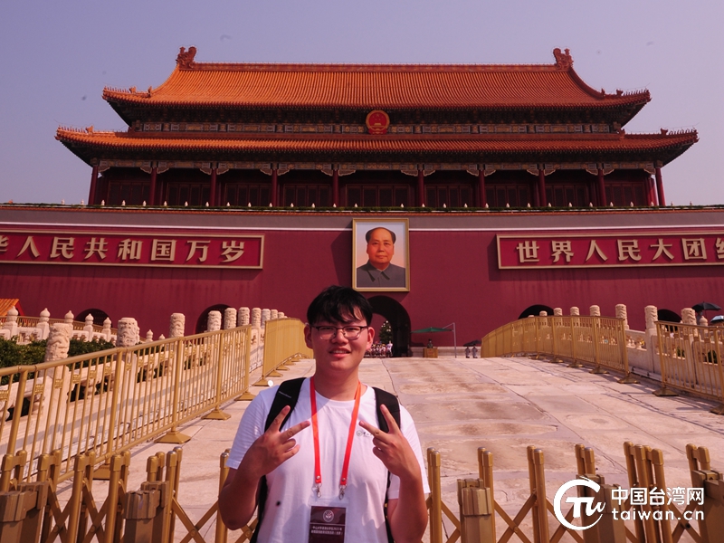 2023年暑期,就讀于中山大學新聞傳播學院的臺生劉承志來到北京,圖為劉承志于天安門城樓前留念。(中國臺灣網 發)