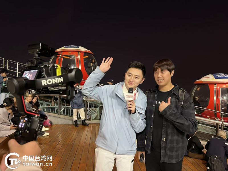 中國臺灣網主持人與臺灣自媒體博主在廣州塔互動拍攝。(中國臺灣網記者 劉琳 攝)