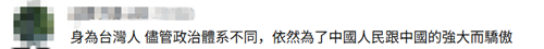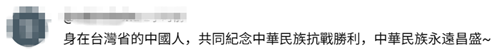 臺灣網友在相關內容下留言表示,“作為一個堂堂正正的中國人,今天真的很驕傲”,“身在臺灣省的中國人,共同紀念中華民族抗戰勝利,中華民族永遠昌盛”,“身為臺灣人,盡管政治體係不同,依然為了中國人民跟中國的強大而驕傲”。