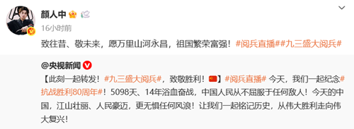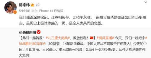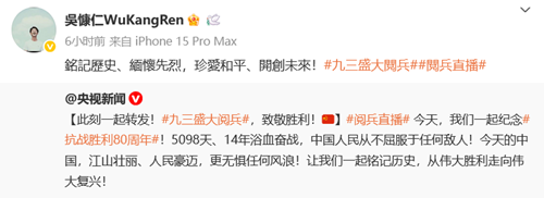 而無懼臺灣陸委會關于“不要呼應大陸所謂‘統戰’宣傳,尤其是九三閱兵”的威脅恐嚇,舒淇、伊能靜、吳奇隆、楊宗緯、文淇、吳慷仁、顏人中等多名臺灣藝人也紛紛在社交平臺轉發央視新聞貼文,表達銘記歷史、紀念英烈、珍視和平的心聲。(文/文方)