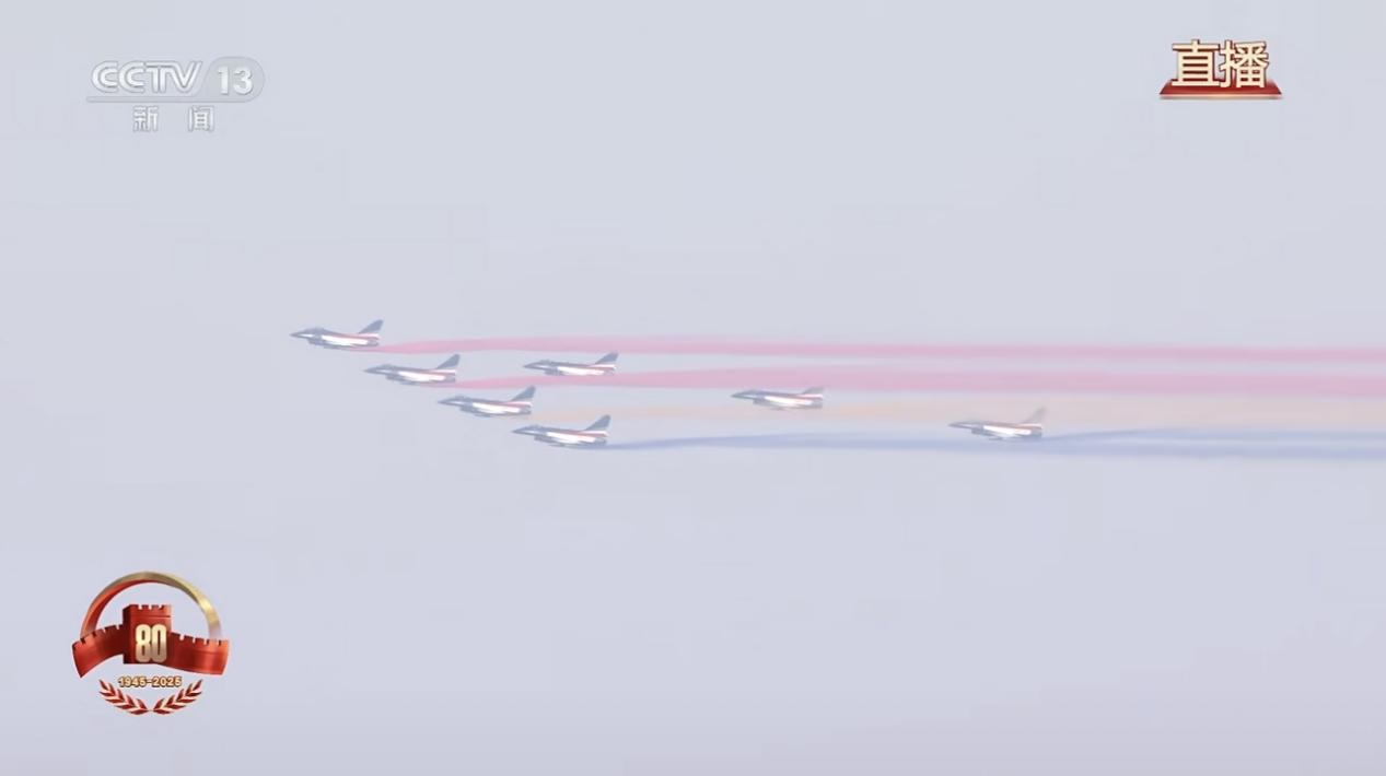 教練機梯隊接受檢閱時拉出14道彩煙,寓意中華民族14年可歌可泣的抗戰歷程,象徵著14億多中國人民奔向強國復興的光明前景。(央視直播截屏)