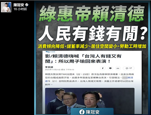 中國國民黨青年部前主任陳冠安評論稱,賴清德真是“綠惠帝”,根本是“何不食肉糜”翻版。他列舉數據表示,臺灣民眾儲蓄率已連續4年減少,2021年到2024年從25.23%下滑到23.73%。消費傾向從78.73%下降到76.27%,2024年的平均住宅坪數也創下2000年以來新低紀錄。民眾越來越窮,但有閒了嗎?他說,賴清德同樣錯得離譜。根據臺勞動部門數據,2024年每人每月平均工時達169.2小時,創6年新高,而每人每月加班工時8.5小時,更是10年最高,“人民有錢嗎?”