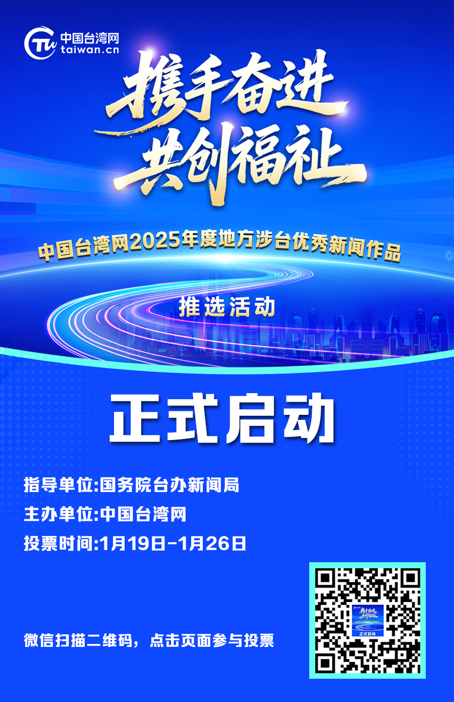 為係統盤點、梳理過去一年地方涉臺活動精彩亮點,展示各地涉臺工作成效,進一步凝聚兩岸同胞推動實現祖國統一的網絡共識,經國務院臺辦批準,中國臺灣網“2025年度地方涉臺優秀新聞作品”推選活動于1月19日正式上線啟動。
