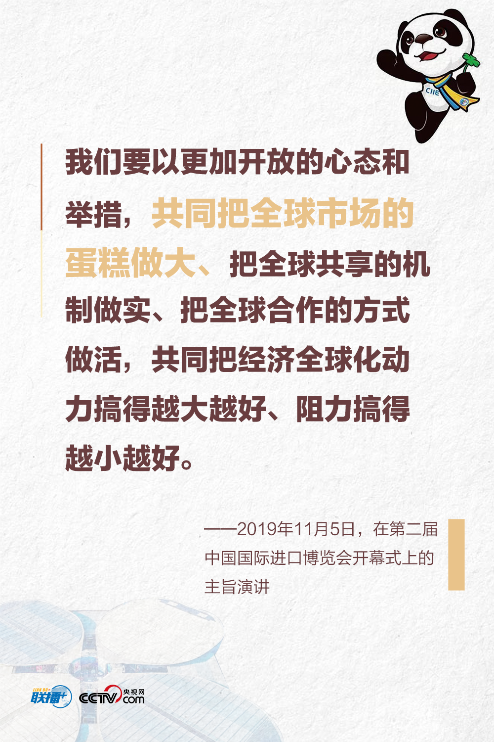 “要堅持合作共贏理念,信任而不是猜忌,攜手而不是揮拳,協商而不是謾罵,以各國共同利益為重,推動經濟全球化朝著更加開放、包容、普惠、平衡、共贏的方向發展”,“各國走向開放、走向合作的大勢沒有改變”。
