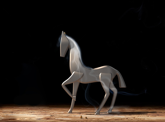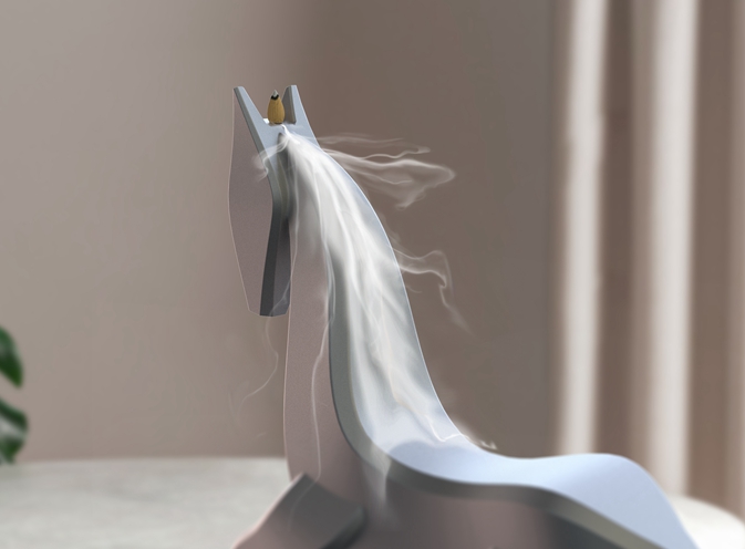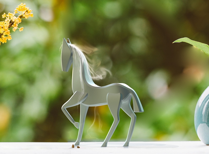 香爐的主體,是一只低頭思考的馬,頭頂處是可以放置自流香的小平臺,香爐的極簡線條提取身形秀麗的馬兒,將其線條再次簡化提煉,最終使得香爐有著天然的優美體型。借助自流香煙霧流下時的變幻無窮,讓煙霧隨馬脖頸流動,慢時如馬兒靜觀世界,快時如清風拂過馬鬃。