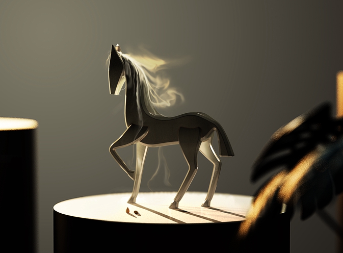 其靈感來源于變幻無窮的倒流香煙霧,倒流香的煙霧在流動時,似草原上奔馬飄動的鬃毛。不論是書畫還是雕塑都不能形象表現出馬兒奔跑時馬鬃飄逸的優美。而倒流香煙霧縹緲時可以非常好的展現馬兒馬鬃的飄逸風採。