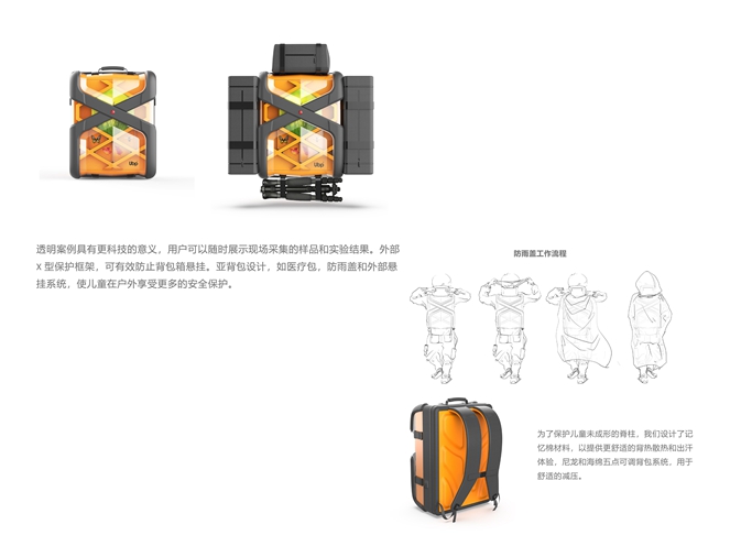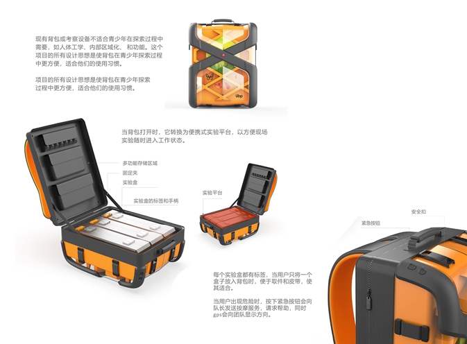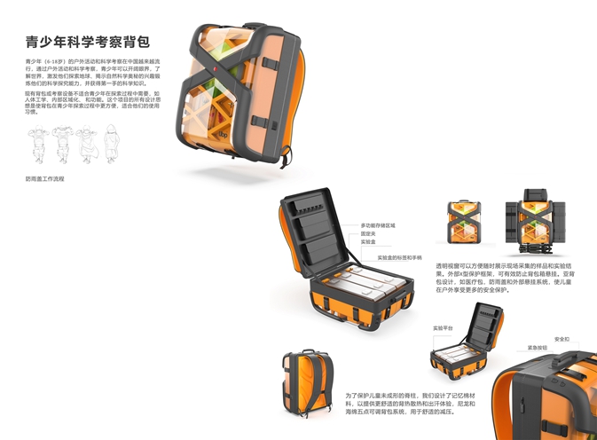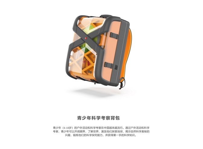 現有背包或考察設備不適合青少年在探索過程中的需要,如人體工學,內部區域化和功能。這個項目的所有涉及思想是使背包在青少年探索過程中更方便,適合他們的使用習慣。