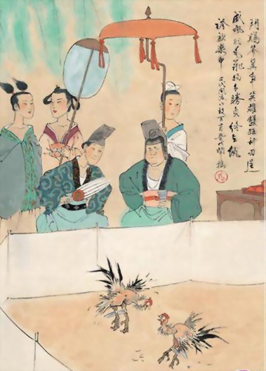 娛樂鬥雞發展成賭博,賭徒們就更如癡如狂了。唐代韓愈與孟郊以鬥雞為題寫過精彩的聯句,描述兩雞惡鬥,鬥雞人在勝負未卜時,“旁驚汗流浼”,緊張不安,汗流滿面。優劣分明時,“知雄欣動顏”,勝的一方高興得眉飛色舞。敗的一方“怯負愁看賄”,眼看輸掉錢財,愁眉苦臉。人們“爭觀填道,助叫波翻海”。是講觀者擠滿街市道路,吶喊驚叫之聲,如大海怒濤。真是如醉如狂呀!