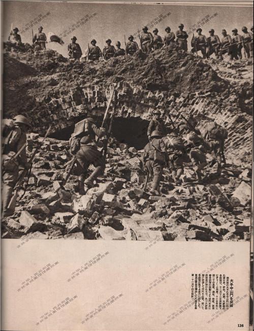 此圖出自朝日新聞社發行的支那事變寫真全集(中)上海戰線,為南京攻略戰的圖片。日軍各部隊1937年12月12日在敵人的槍林彈雨下逐漸逼近南京正門中山門,13日上午3點20分,炮轟襲擊後在城門左右開辟了突擊路線。首先大野部隊突擊佔領中山門,接下來各部隊陸續衝入城內,該照片為揮舞軍旗入城的皇軍。