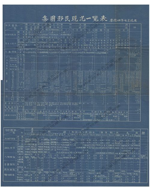 從1932年10月第一次武裝移民團開始,日本先後進行的6次“集團移民”。館藏中的一張集團移民現狀一覽表體現出從第一次到第六次日本集團移民的分布、數量、現狀等(其中包括彌榮村、千鎮村等移民的地理位置、指導員關係、入殖關係、營農關係、農產加工、戶數、教育、衛生、交通等方面都做了較詳盡的統計)。
