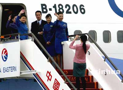 執行臺商春節包機首航任務的臺灣“中華航空公司”班機機組人員在上海浦東機場載運200多名臺商和眷屬後告別上海。新華社記者張明攝