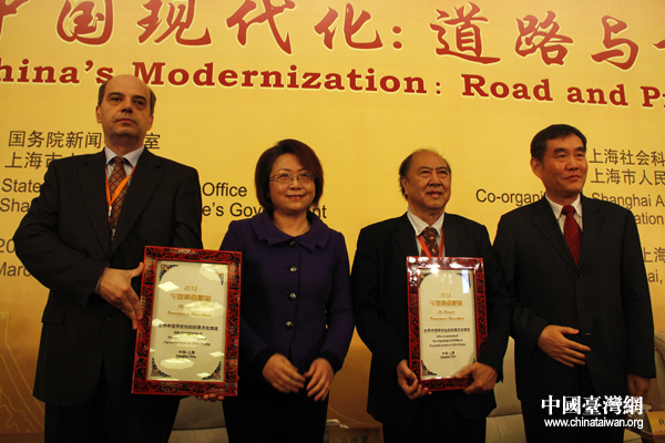 中國臺灣網3月24日上海消息 以“中國現代化:道路與前景”為主題的第五屆世界中國學論壇23日在上海開幕。開幕式上,上海市人民政府副市長翁鐵慧揭曉了第二屆“世界中國學貢獻獎”,該獎項的獲得者是:俄羅斯科學院院士、俄羅斯前特命全權駐華大使齊赫文斯基,美國費正清研究中心前主任傅高義和香港中文大學中文係榮休講座教授饒宗頤。