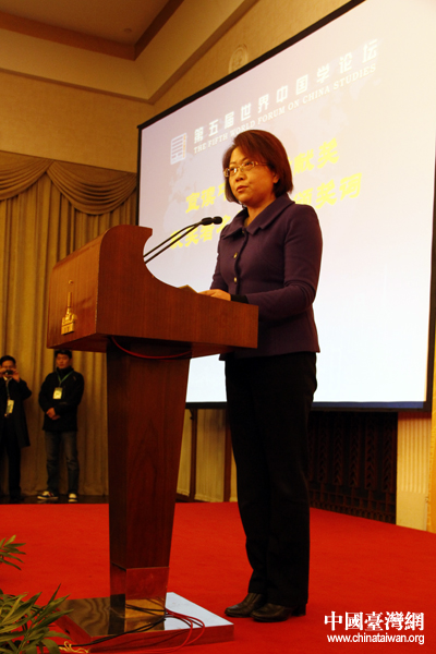 上海市人民政府副市長翁鐵慧宣讀中國學貢獻獎獲獎者名單、致頒獎詞。(中國臺灣網 張潔 攝)