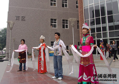在“投入民族大家庭,感受民族溫暖情”為主題的歡迎儀式上,民族大學的學生為臺灣客人獻上了象徵友情與祝福的哈達,並且紛紛用各自民族的語言向客人們致意。