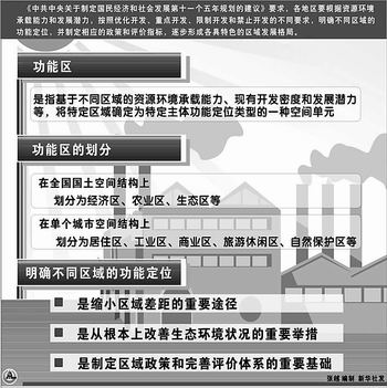 對于這“四類功能區”要把握兩點。第一是對各主體功能區要有不同的評價標準。譬如對禁止開發的生態區就不要把GDP當成衡量標準,這樣地區的GDP可以是零增長甚至負增長;對于優先開發地區也不能光看GDP,要考核其人均收入增長。第二是要實施功能性經濟政策。現在納入考慮范疇的有財政政策、稅收政策,今後也許還需要納入投資政策。