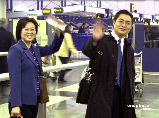 資料圖:大陸首批赴臺駐點採訪記者2001年2月8日離開北京,新華社記者范麗青和陳斌華清晨乘CA101航班飛經香港,當天抵達臺北,開始新世紀臺海兩岸倍受關注的新聞之行。 中新社發 賈國榮 攝