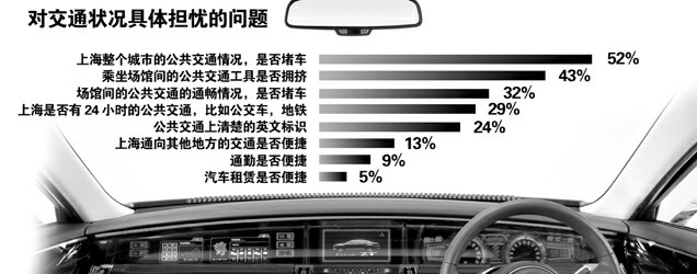 交通(57.6%)、環境(28.6%)、食品安全(26.4%)是外籍人士參觀2010年世博會“最擔心的問題”。其中對交通狀況的擔心主要集中在交通堵塞和擁擠方面(見圖O);對環境問題的擔心主要集中在空氣質量方面;對食品安全問題的擔心主要來自對中國食品安全狀況的總體印象。