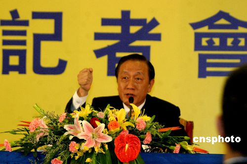 七月十二日,臺灣新黨紀念抗戰勝利六十周年大陸訪問團記者會在北京飯店舉行,新黨主席鬱慕明在記者會上回答媒體的提問。(來源:中新網)
